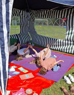 Abenteuerlich wurde es am Lagerfeuer, bei dem die Kinder selbst Popcorn zubereiten und sich gemeinsam mit ihren Eltern an einer Kreativaktion „mit Feuer und Flamme“ versuchen durften, sowie beim herausfordernden Seilparcours mit verbundenen Augen, bei dem es um Mut und Vertrauen ging. Einen Ausgleich dazu stellte schließlich eine entspannende Station dar, in der Mädchen und Jungen sich beim Kinderyoga ausprobieren konnten, sowie das Partyzelt mit Discokugel, in dem bei Bewegungsspielen getanzt, gezappelt und gelacht wurde.