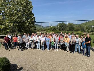 Die Teilnehmer der diesjährigen Seniorenfahrt im Garten des Kloster Machern, im Hintergrund die Hochmoselbrücke.