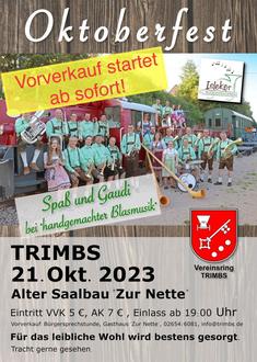 Nach dem historischen ersten Oktoberfest aus Anlass des 1000-jährigen Bestehens von Trimbs 2019 folgt nun das 2. Oktoberfest am Samstag, 21. Oktober 2023 im alten Saalbau „Zur Nette“. Veranstalter sind Vereinsring und Ortsgemeinde Trimbs. Das Highlight dabei wird wiederum der „Isleker Musikanten-Express“ sein. Handgemachte Blasmusik der Extraklasse sowie Spaß und Gaudi erwarten die Besucher. Für das leibliche Wohl wird bestens gesorgt. Gerne können die Besucher auch in Tracht den geselligen Abend verbringen. Der Einlass ist ab 19:00 Uhr.