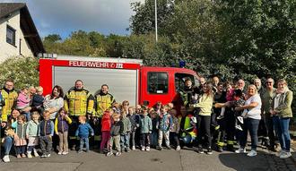 Kinder, Erzieherinnen sowie die Kameradinnen und Kameraden der Feuerwehren Trimbs und Welling nach der Durchführung der diesjährigen Brandschutzübung vor der KiTa "Traumland" Trimbs