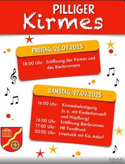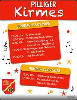 vom 26. bis 29. September 2025 lädt die Ortsgemeinde Pillig herzlich zur traditionellen St.-Firminus-Kirmes auf unseren Dorfplatz ein.
