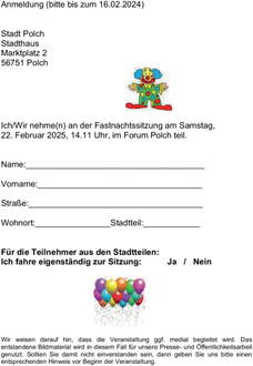 Ich/Wir nehme(n) an der Fastnachtssitzung am Samstag, 22. Februar 2025, 14.11 Uhr, im Forum Polch teil.