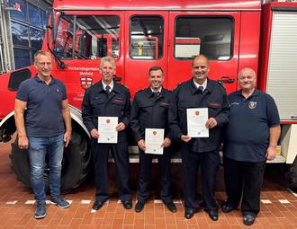 Erstmals hat der Löschzug Münstermaifeld jetzt auch einen zweiten stellvertretenden Wehrführer: Sören Steffes übernimmt diese Funktion ab sofort. Er ist schon seit 25 Jahren Mitglied der Freiwilligen Feuerwehr Maifeld, Löschzug Münstermaifeld, hat die notwendigen Lehrgänge absolviert und ist damit bestens für den Posten gerüstet. Zu den ersten Gratulanten gehörten Bürgermeister Maximilian Mumm sowie der stellvertretende Wehrleiter der Verbandsgemeinde Maifeld Uwe Mayer.