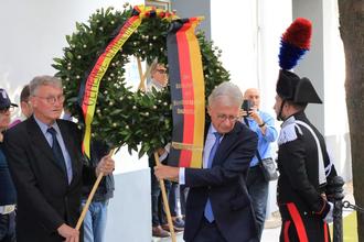 Der deutsche Botschafter Dr. Hans-Dieter Lucas legt mit Bürgermeister Lothar Kalter am Denkmal auf dem Friedhof von Caiazzo einen Kranz nieder.