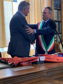 Die beiden Bürgermeister beim Händedruck anlässlich des Flaggentauschs im Ratssaal des Stadthauses von Caiazzo.