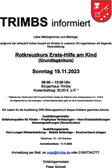 aufgrund der erfreulich hohen Anzahl an Kindern in unserem Ort organisieren wir seitens der Ortsgemeinde Trimbs einen Rotkreuzkurs „Erste-Hilfe am Kind“. Das Angebot richtet sich primär an Eltern oder Großeltern, aber auch an sonstige Interessierte.