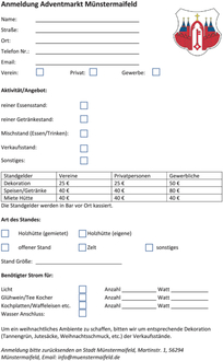Unser diesjähriger Adventsmarkt findet am 29.11.2025 statt. Sollten Sie Interesse haben daran teilzunehmen, füllen Sie bitte das Anmeldeformular aus.