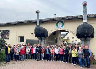 Trimbser Seniorinnen und Senioren am Eingang der Straußenfarm „Gemarkenhof“ in Remagen