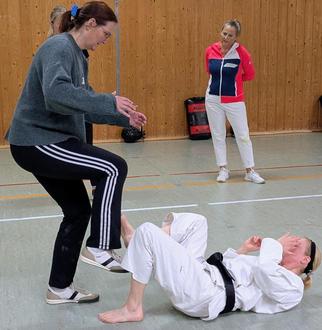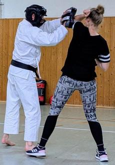 Z.b. ein Schlag mit dem Handballen oder der Faust bzw. mit dem Ellenbogen zum Kopf. In der Turnhalle der Cusanus-Grundschule Münstermaifeld trainierte sie mit den Teilnehmerinnen zwischen 15 und 55 Jahren Schlag-, Tritt- und Hebeltechniken zur effektiven Abwehr direkter körperlicher Angriffe. Dabei warnte Michaela Buhl vor der „Angst, dem anderen weh zu tun“: „Die hat der Angreifer nicht, wenn er seinem künftigen Opfer zu Leibe rückt.“