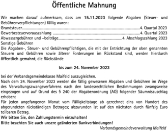 Die Abgaben-, Steuer- und Gebührenpflichtigen, die mit der Entrichtung der oben genannten Steuern und Gebühren sowie älterer Forderungen im Rückstand sind, werden hierdurch öffentlich gemahnt, die Rückstände