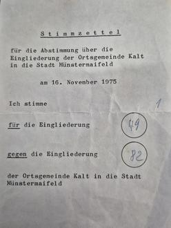 Vor 50 Jahren stand Kalt vor einer wichtigen Entscheidung: Sollten wir uns der Stadt Münstermaifeld anschließen oder unseren eigenständigen Weg weitergehen? Ein Blick auf die damaligen Stimmzettel zeigt: Einige Bürgerinnen und Bürger befürworteten die Eingliederung, doch die Mehrheit entschied sich bewusst dagegen.