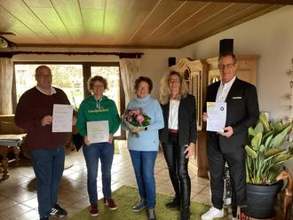 Ortsbürgermeister Michael Kopp, Tina Brust (Tourismus VG Maifeld), Gastgeberin Elfi Kalter, Petra Wuitschik (Rhein-Mosel-Eifel-Touristik), Bürgermeister Maximilian Mumm (von links).