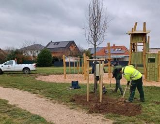 Es ist geschafft, unser wirklich großes Pflanzvorhaben ist fertig. 30 Bäume und fasst 300 Sträucher wurden Anfang Dezember auf den Freiflächen im Wohngebiet „Im Kleegarten“ sowie auf dem neuen Spielplatz gepflanzt.