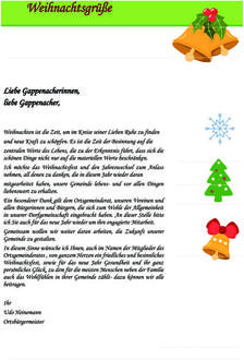 Ich möchte das Weihnachtsfest und den Jahreswechsel zum Anlass nehmen, all denen zu danken, die in diesem Jahr wieder daran mitgearbeitet haben, unsere Gemeinde lebens- und vor allen Dingen liebenswert zu erhalten.
