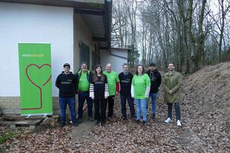 Ehrenamtliche Helferinnen und Helfer haben am Sporthaus in Wierschem das Mauerwerk trockengelegt. Dieses war erheblich beschädigt, so dass Feuchtigkeit ins Innere des Gebäudes ziehen konnte. Neben Baggerarbeiten, der Putzsanierung außen und einem neuen Schutzanstrich verlegten die Ehrenamtlichen Verbundsteine und gaben der Außenwand einen neuen Anstrich. Unterstützt wurde die Aktion von Westenergie durch die Mitarbeitendeninitiative „aktiv vor Ort“ mit einer Fördersumme in Höhe von 2.000 Euro.
