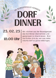 Wir möchten aus der Bauwagenzeit gerne das Dorfdinner übernehmen und gemeinsam am 25.2.2025 um 18 Uhr im Bürgerhaus zu Abend essen. Brot und Butter sind da, wer etwas teilen möchte, darf es gerne mitbringen.