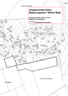 Der Ortsgemeinderat von Hirten hat in der öffentlichen Sitzung am 23.11.2022 den Beschluss zur Aufstellung eines Bebauungsplanes für das Teilgebiet „Weiler Weg“ gefasst, um das förmliche Aufstellungsverfahren in Gang zu setzen. Darüber hinaus wurde am 01.02.2024 der Entwurf anerkannt sowie die frühzeitige Beteiligung der Öffentlichkeit in Form einer öffentlichen Auslegung des Bebauungsplanentwurfes gemäß § 3 Abs. 1 BauGB beschlossen.