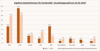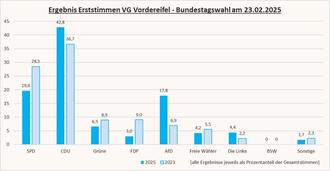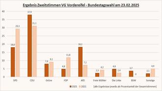 Bei der Wahl zum 21. Deutschen Bundestag am 23. Februar 2025 waren in der Verbandsgemeinde Vordereifel 13.358 Einwohnende wahlberechtigt, wovon 11.614 Menschen tatsächlich gewählt haben. Dies entspricht einer Wahlbeteiligung von 86,9 Prozent.
