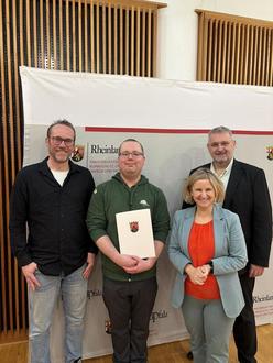 (Foto v.l.n.r.): Frank Pohl (Ortsbürgermeister von Kirchwald), Phillipp Schröder (Wildvogel Pflegestation Kirchwald), Katrin Eder (Umweltministerin) und Christoph Kicherer (Erster Beigeordneter) bei der Verleihung des Tierschutzpreises 2025 in Mainz