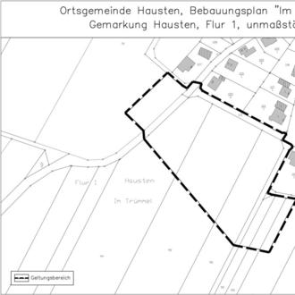 Der vorgesehene Geltungsbereich des Bebauungsplanes liegt in der Gemarkung Hausten, Flur 1; er ist in der nachfolgend abgedruckten Plankarte (Auszug aus den Geobasisinformationen - Liegenschaftskarte -), die als Anlage Bestandteil dieser Öffentlichen Bekanntmachung ist, durch eine schwarz gestrichelte Linie umgrenzt.
