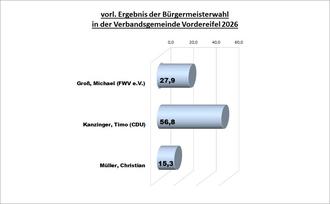 Die Verbandsgemeinde Vordereifel hat einen neuen Bürgermeister. Die Bürgerinnen und Bürger in der Verbandsgemeinde Vordereifel haben sich entschieden: laut dem vorläufigen Endergebnis der Bürgermeisterwahl hat Timo Kanzinger aus Kehrig die Wahl mit 56,8 % der abgegebenen Stimmen gewonnen.