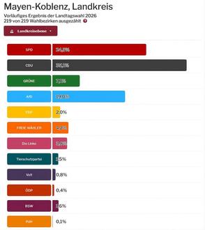 Die Stimmverteilung im gesamten Landkreis Mayen-Koblenz weist das folgende vorläufige Endergebnis auf: