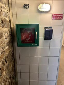 Ab sofort findet man den Defibrillator im Viergiebelhaus im Vorraum der öffentlichen Toiletten. Der Zugang wird rund um die Uhr geöffnet sein.