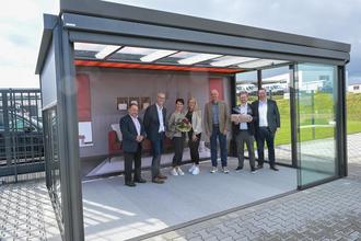Bürgermeister Alfred Schomisch, Ortsbürgermeister Thomas Braunstein und Wirtschaftsförderin Anna Döpgen lassen sich die vielseitigen Möglichkeiten des Außenschauraums "Sommergarten" von den Geschäftsinhabern und Vertretern der Firma Markilux erläutern.