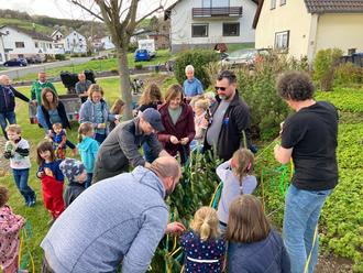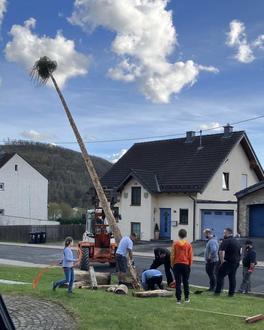 Bereits einige Tage vorher war der Baum bereitgestellt worden. Nun galt es zunächst, die Spitze zu schmücken. Beim Verzieren der Baumspitze mit vielen bunten Bändern hatten insbesondere die Kinder großen Spaß. Zu guter Letzt wurde der Baum in seiner Halterung aufgestellt und verankert. Für dieses Spektakel hatten sich zahlreiche Zuschauer aus der Dorfbevölkerung eingefunden.