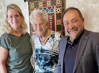 Die Jubilarin Leni May umrahmt von Verbandsbürgermeister Alfred Schomisch und Ortsbürgermeisterin Corinna Behrendt