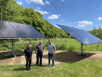 Bürgermeister Alfred Schomisch informiert sich über die neu installierte Photovoltaik-Anlage im Gebiet der Kläranlage Mimbachtal. Bei der Anlage handelt es sich um eine sogenannte Tracker-Anlage, die vollautomatisch dem Sonnenstand folgt und sich stets im optimalen Winkel ausrichtet. Dadurch arbeitet sie deutlich effizienter als herkömmliche Anlagen.