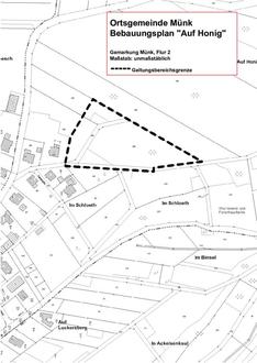 Der vorgesehene Geltungsbereich des Bebauungsplanes liegt in der Gemarkung Münk, Flur 2. Er ist in der nachfolgenden Plankarte durch eine gestrichelte Linie umgrenzt (siehe Anlage).