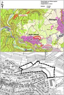 Der vorgesehene Geltungsbereich des Bebauungsplanes liegt in der Gemarkung St. Johann, Flure 3 und 4. Er ist in der nachfolgend abgedruckten, unmaßstäblichen Geltungsbereichskarte durch eine gestrichelte Linie umgrenzt.