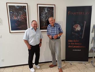 Bürgermeister Alfred Schomisch (li.) mit Toni Schüller (Altbürgermeister und Ehrenbürger von Kottenheim) bei Betrachtung der Fotos in der Ausstellung „Finsterlay“ im Rathaus der Verbandsgemeinde Vordereifel