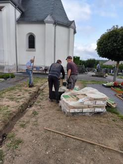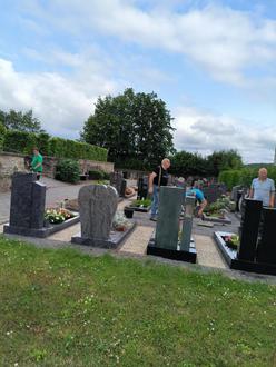 nachdem die Aktivitätsberichte unserer Rentnertruppe in den letzten Wochen etwas zu kurz gekommen sind, hier nochmal ein kurzer Tätigkeitsbericht: Hatte man in den letzten Wochen die Beete am Saberg und die „neuen“ Bänke in der Ortslage verteilt und befestigt, so stand am vergangenen Mittwoch nochmals die Pflege unseres gemeinsamen Friedhofs an: Hecken wurden geschnitten, die letzten Waschbetonplatten in den Grabreihen verlegt und ein Fundament für die nächste Grabreihe wurde ausgehoben und betoniert.