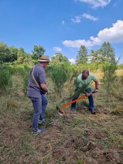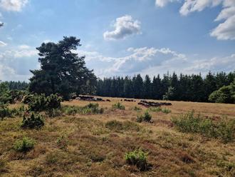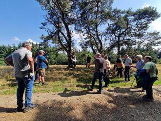 Im Anschluss führte Marcus Hüsgen die Gruppe über den Büschberg – ein Herzstück der Wacholderlandschaft in der Osteifel. Dort wurde zu Beginn des Projekts die gesamte Fläche geplaggt, das heißt, die Humusschicht wurde entfernt und die Fläche mit Heidesaatgut neu eingesät. Insgesamt wurden auf dem rund 17 Hektar großen Areal über 285 Festmeter Holz entfernt, teils mithilfe kontrollierter Feuer. Heute ist der Büschberg ein wertvoller Rückzugsort für zahlreiche Tier- und Pflanzenarten – darunter das seltene montane Borstgras und die Gottesanbeterin, die jüngst im Rahmen einer Kinderferienaktion gleich mehrfach gesichtet wurde.