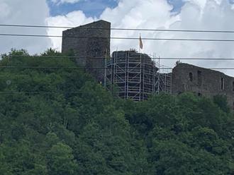 das Gerüst an der Burg ist mittlerweile gestellt, sodass die weiteren Arbeiten am Turm planmäßig im August starten können.