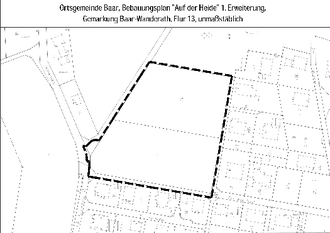 Der vorgesehene Geltungsbereich des Bebauungsplanes liegt in der Gemarkung Baar, Flur 13. Er ist in der nachfolgend abgedruckten, unmaßstäblich verkleinerten Planzeichnung durch eine gestrichelte Linie umgrenzt.