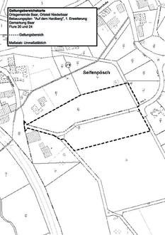 Der vorgesehene Geltungsbereich des Bebauungsplanes liegt in der Gemarkung Baar, Flure 20 und 24; er ist in der nachfolgend abgedruckten Plankarte (Auszug aus den Geobasisinformationen - Liegenschaftskarte -), die als Anlage Bestandteil dieser öffentlichen Bekanntmachung ist, durch eine schwarz gestrichelte Linie umgrenzt.