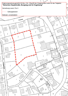 Der vorgesehene Geltungsbereich der Satzung liegt in der Gemarkung Luxem, Flur 4; er ist in der nachfolgend abgedruckten Plankarte (Auszug aus den Geobasisinformationen - Liegenschaftskarte -), die Bestandteil dieser Öffentlichen Bekanntmachung ist, durch eine rot gestrichelte Linie umgrenzt. Das Verfahren wird gemäß § 34 Abs. 6 BauGB nach den Vorschriften des § 13 BauGB (vereinfachtes Verfahren) geführt.