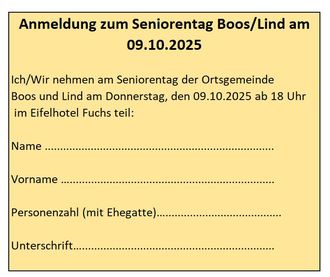 Bitte reichen Sie für unsere Planung den beigefügten Anmeldezettel bis zum 5. Oktober bei einem der beiden Beigeordneten aus Boos, Edmund Röser / Martin Thome, oder dem Bürgermeister aus Lind, Wolfgang Spiering, ein. Gerne können Sie uns ihre Teilnahme auch per Mail an ortsgemeinde@boos-eifel.de zukommen lassen.