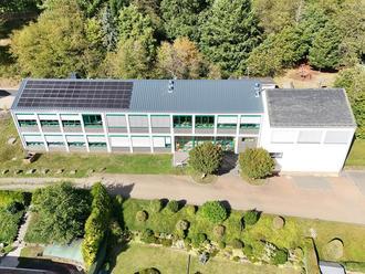 Drohnenaufnahme der Grundschule Herresbach mit dem neuen Dach und der neuen Photovoltaikanlage (links im Bild)
