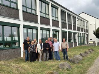 v.l.n.r.: Torsten Zilles (Ortsbürgermeister Virneburg), Alexandra Lazer (Sachgebietsleiterin Natürliche Lebensgrundlagen, Bauen), Anna Döpgen (Fachbereichsleiterin 3 – Bürgerdienste), Lydia Stuntz (komm. Schulleiterin Grundschule Herresbach), Bürgermeister Alfred Schomisch, Erwin Augel (Ortsbürgermeister Baar), Andreas Pung (Fachbereichsleiter 4 – Kommunale Infrastruktur) Klaus Augel (Ortsbürgermeister Welschenbach), Achim Bürger (Ortsbürgermeister Herresbach) und Helmut Schmitt (Ortsbürgermeister Siebenbach) beim gemeinsamen Ortstermin an der Grundschule Herresbach
