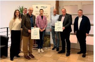 Vertreter der beteiligten Verbandsgemeinden sowie des Regionalmanagements präsentieren der LAG Osteifel-Ahr die neuen LEADER-Förderhinweis-Schilder.