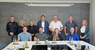 Frohe Gesichter im Rathaus der Verbandsgemeinde Vordereifel nach der offiziellen Vertragsunterzeichnung zur Überleitung der kommunalen Forstwirte von der Verbandsgemeinde Vordereifel als Mitarbeitende im Forstzweckverband Vordereifel-Mendig (hintere Reihe stehend, v.l.n.r.): Stephan Eiden (stv. Fachbereichsleiter 2 – Finanzen, Verbandsgemeinde Vordereifel), Carmen Schäfer (Sachgebietsleiterin Personal, Verbandsgemeinde Vordereifel), Bürgermeister Alfred Schomisch (Verbandsgemeinde Vordereifel), Vorsteher des Forstzweckverbands Vordereifel-Mendig Mario Heinrichs, stv. Vorsteher des Forstzweckverbands Vordereifel-Mendig Achim Grün, Bürgermeister Jörg Lempertz (Verbandsgemeinde Mendig) und Michéle Leicht (Sachbearbeiterin Personal, Verbandsgemeinde Vordereifel); vordere Reihe sitzend (v.l.n.r.) die Forstwirte Jonathan Sonnleitner, Christian Simon, Franziska Richrath und Andreas Laug)