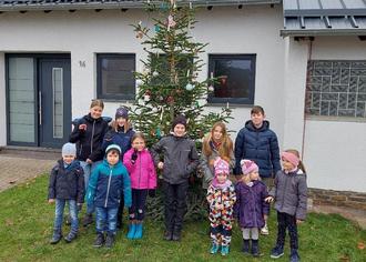 Ein Teil der Kinder am geschmückten Weihnachtsbaum.