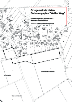 Der Ortsgemeinderat von Hirten hat in der öffentlichen Sitzung am 23.11.2022 den Planaufstellungsbeschluss zum Bebauungsplan für das Teilgebiet „Weiler Weg“ gefasst, um das förmliche Aufstellungsverfahren in Gang zu setzen.