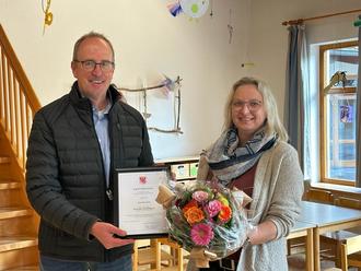 Ortsbürgermeister Rainer Wollenweber und die Kita-Leiterin Alexandra Oster dankten Anke Hück für die in den 25 Jahren geleistete Arbeit die auch oftmals viel Geduld und Einfühlungsvermögen erfordert.