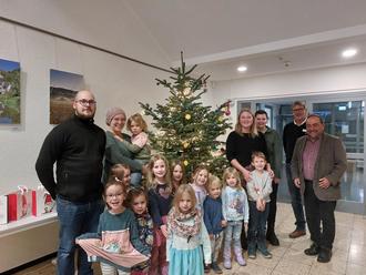 Elf Kinder aus der Kindertagesstätte St. Kastor in Weiler verbreiteten fröhliche Weihnachtsstimmung in der Verbandsgemeindeverwaltung Vordereifel, als sie den Weihnachtsbaum schmücken durften. Die wunderschön geschmückte Tanne leuchtet nun im Foyer des Rathauses.
