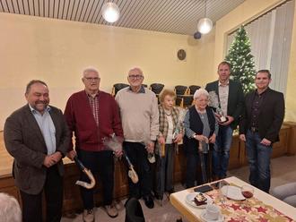 von links nach rechts: Bürgermeister Alfred Schomisch, Helmut Thelen, Karl-Heinz Gäb, Agnes Michels, Klara Gundert, Ortsbürgermeister Martin Freund, Ortsbürgermeister Fabian Steffens